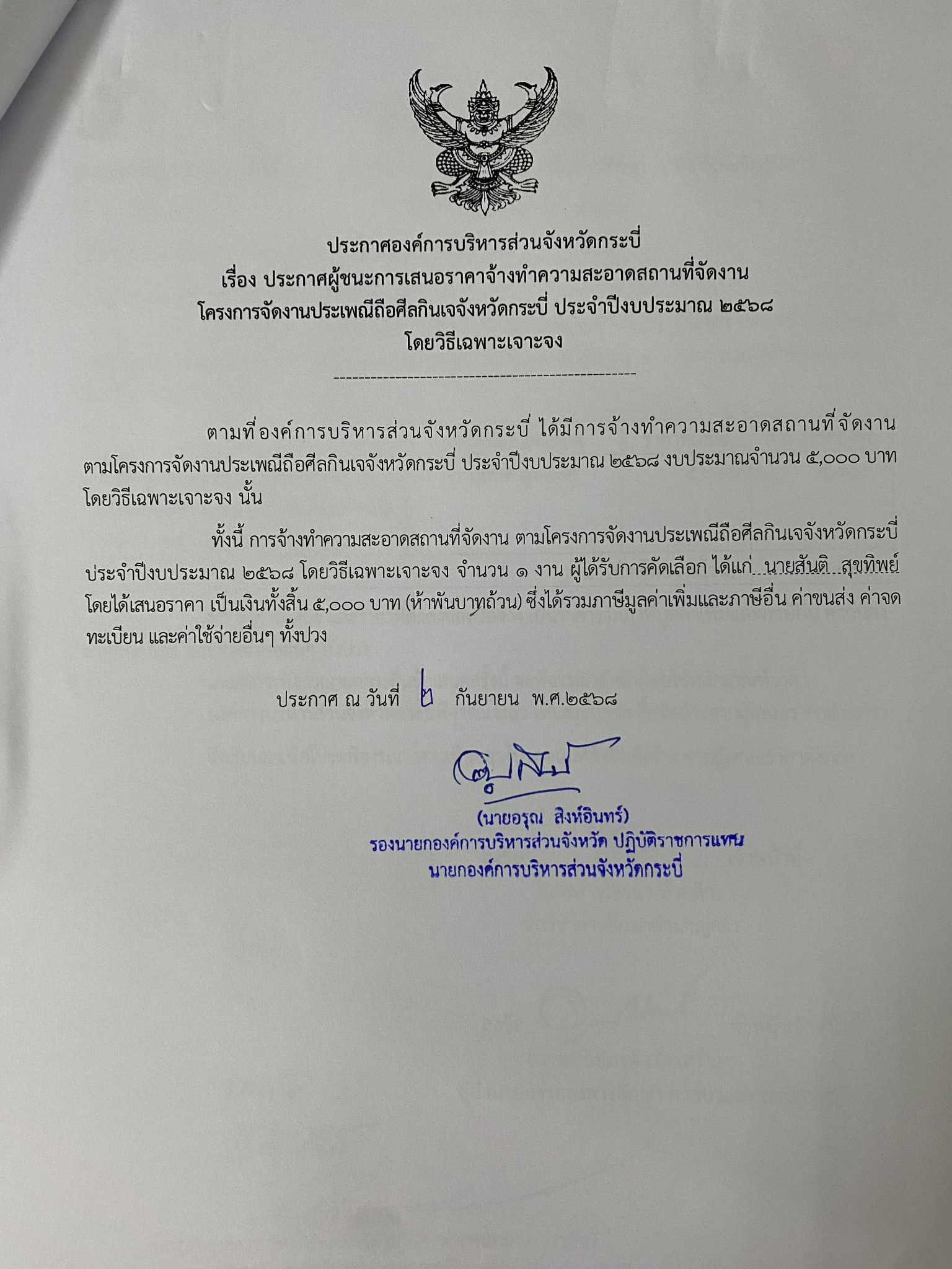 ผู้ชนะการเสนอราคาจ้างทำความสะอาดสถานที่จัดงาน โครงการจัดงานประเพณีถือศีลกินเจจังหวัดกระบี่ ประจำปีงบประมาณ 2568