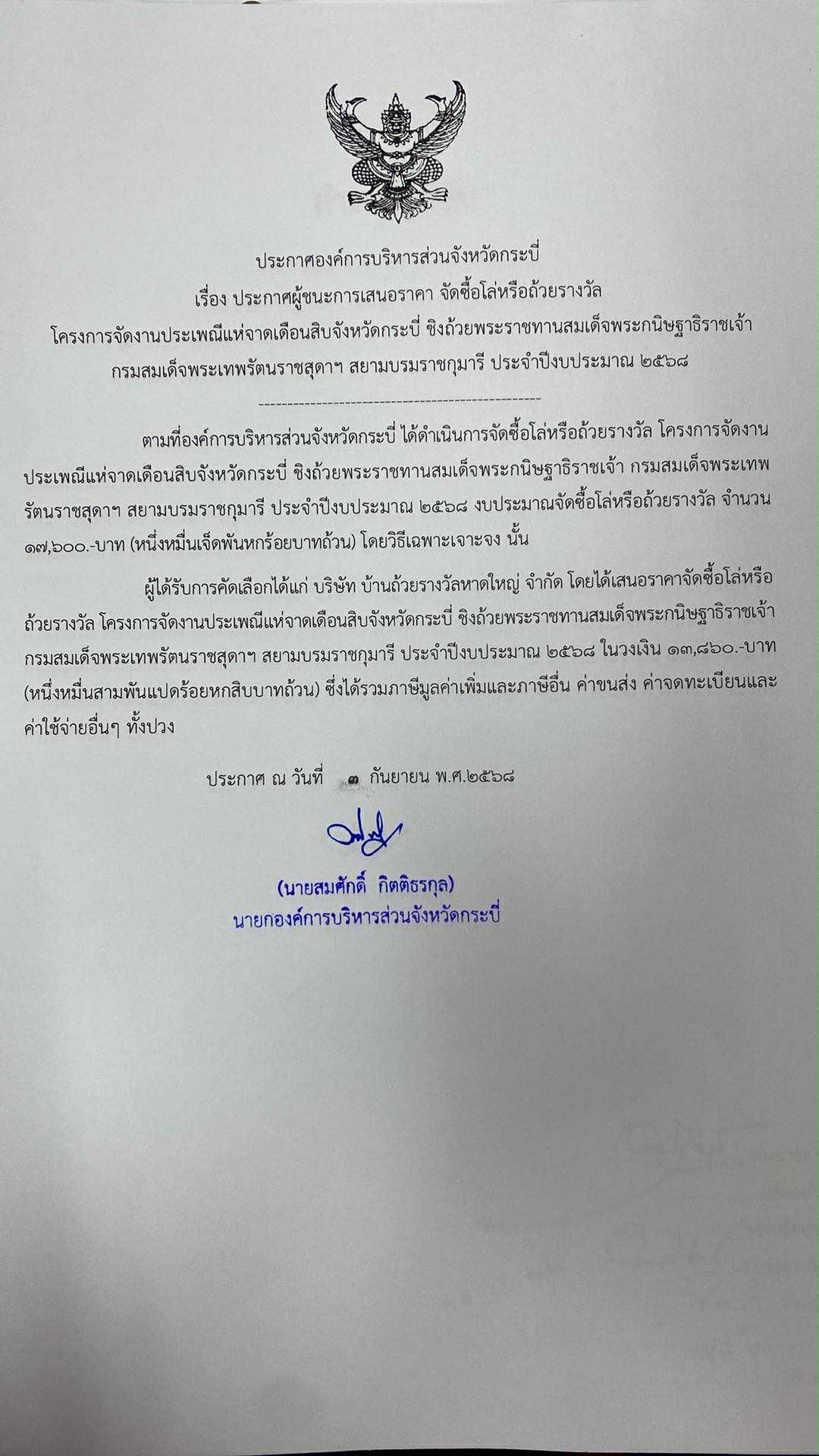 ผู้ชนะการเสนอราคา จัดซื้อโล่หรือถ้วยรางวัล โครงการจัดงานประเพณีแห่จาดเดือนสิบจังหวัดกระบี่ฯ ประจำปีงบประมาณ 2568