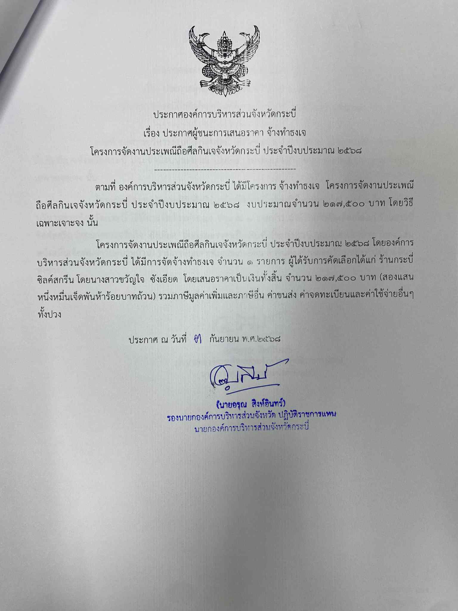 ผู้ชนะการเสนอราคาจัดจ้างจัดและตกแต่งสถานที่ โครงการจัดงานประเพณีแห่จาดเดือนสิบจังหวัดกระบี่ฯ ประจำปีงบประมาณ 2568