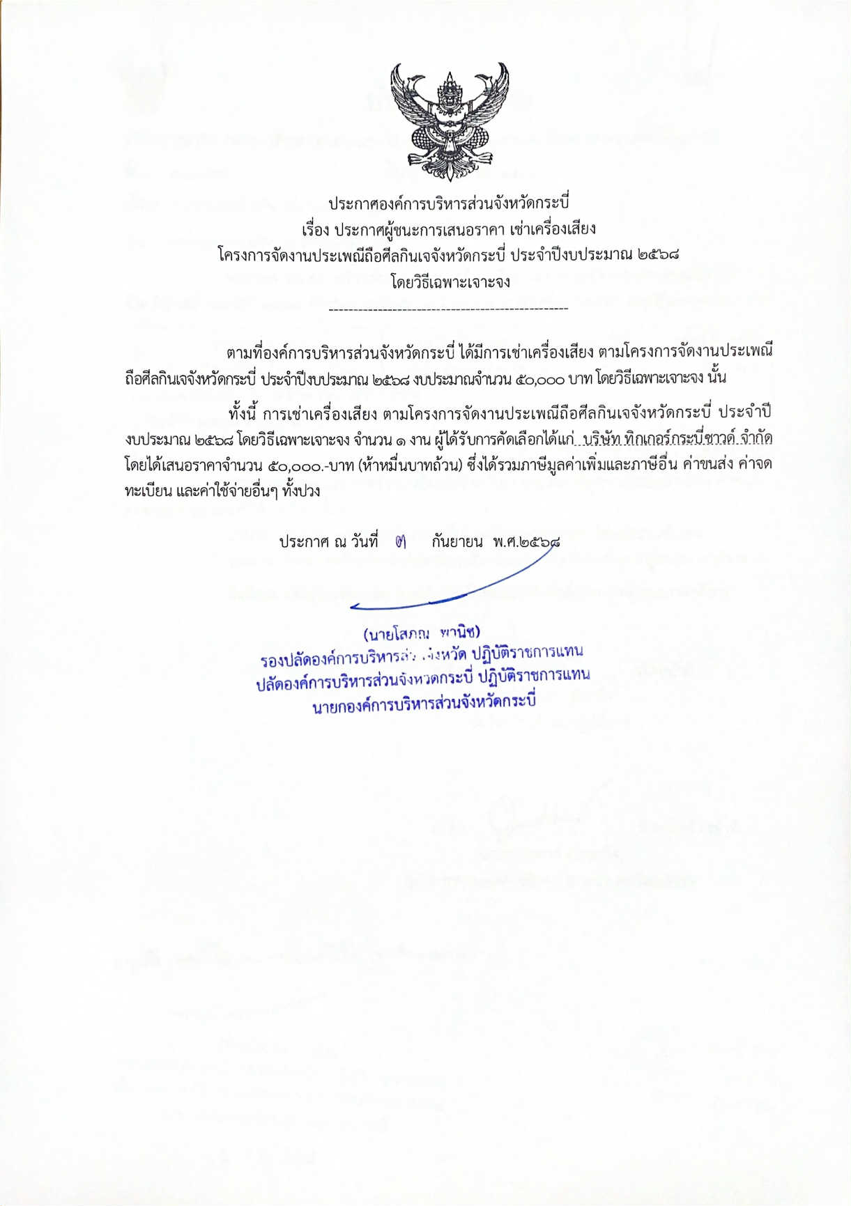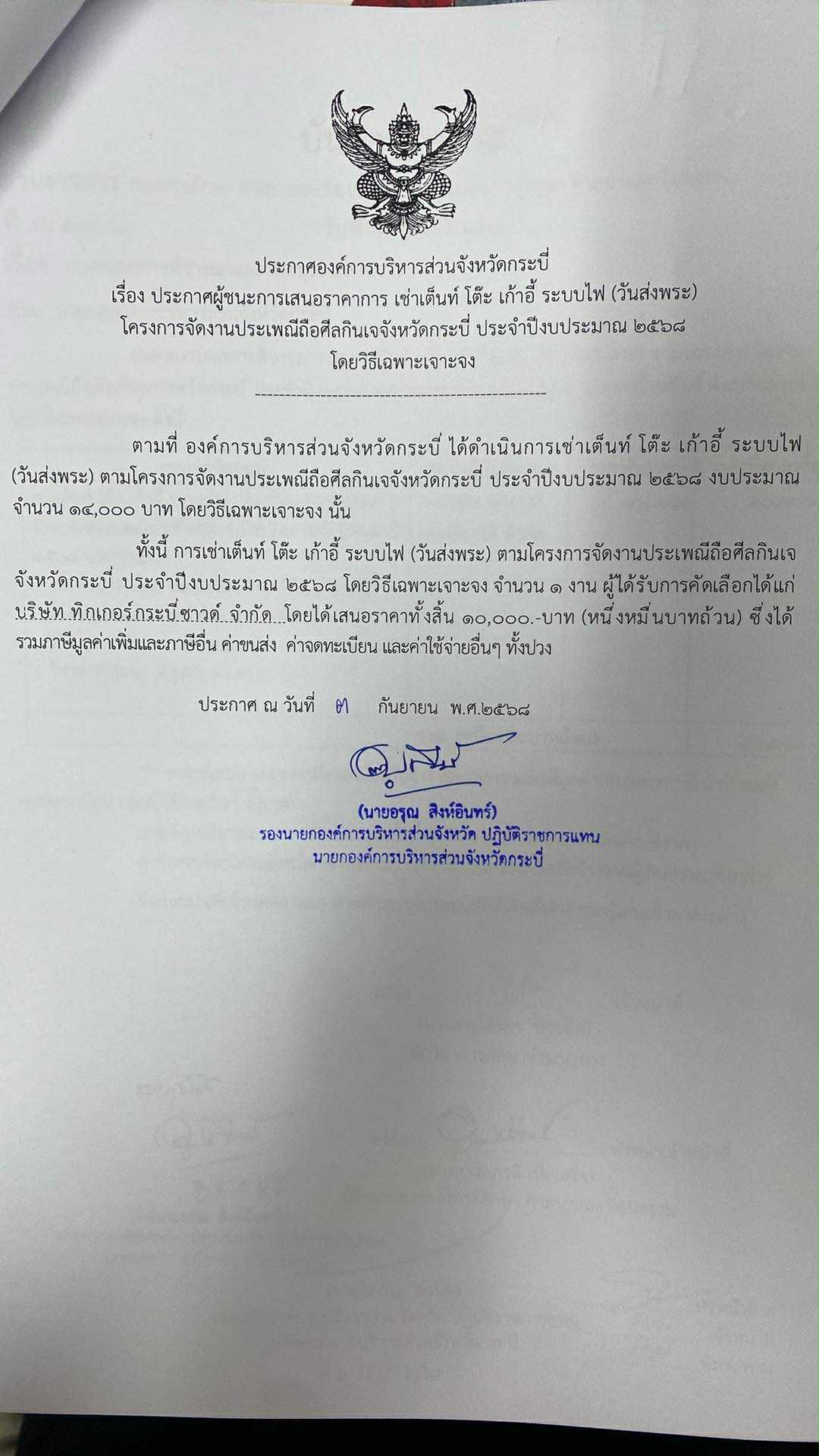 ผู้ชนะการเสนอราคา เช่าเครื่องเสียง โครงการจัดงานประเพณีถือศีลกินเจจังหวัดกระบี่ ประจำปีงบประมาณ 2568