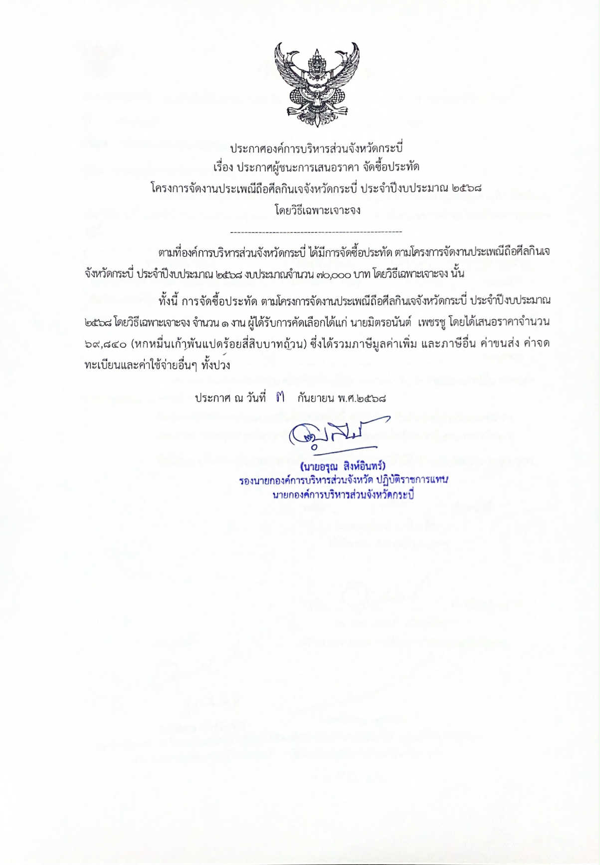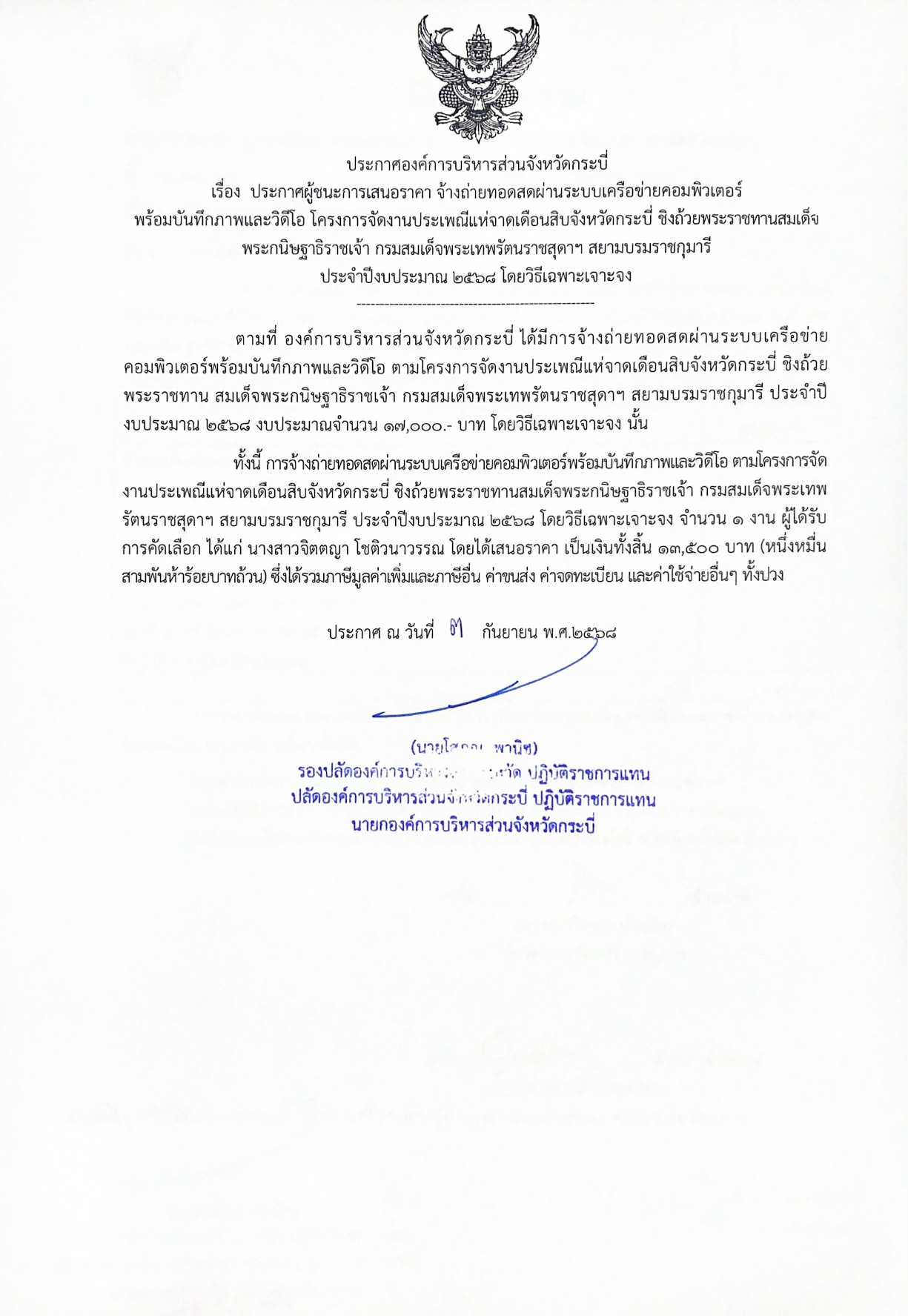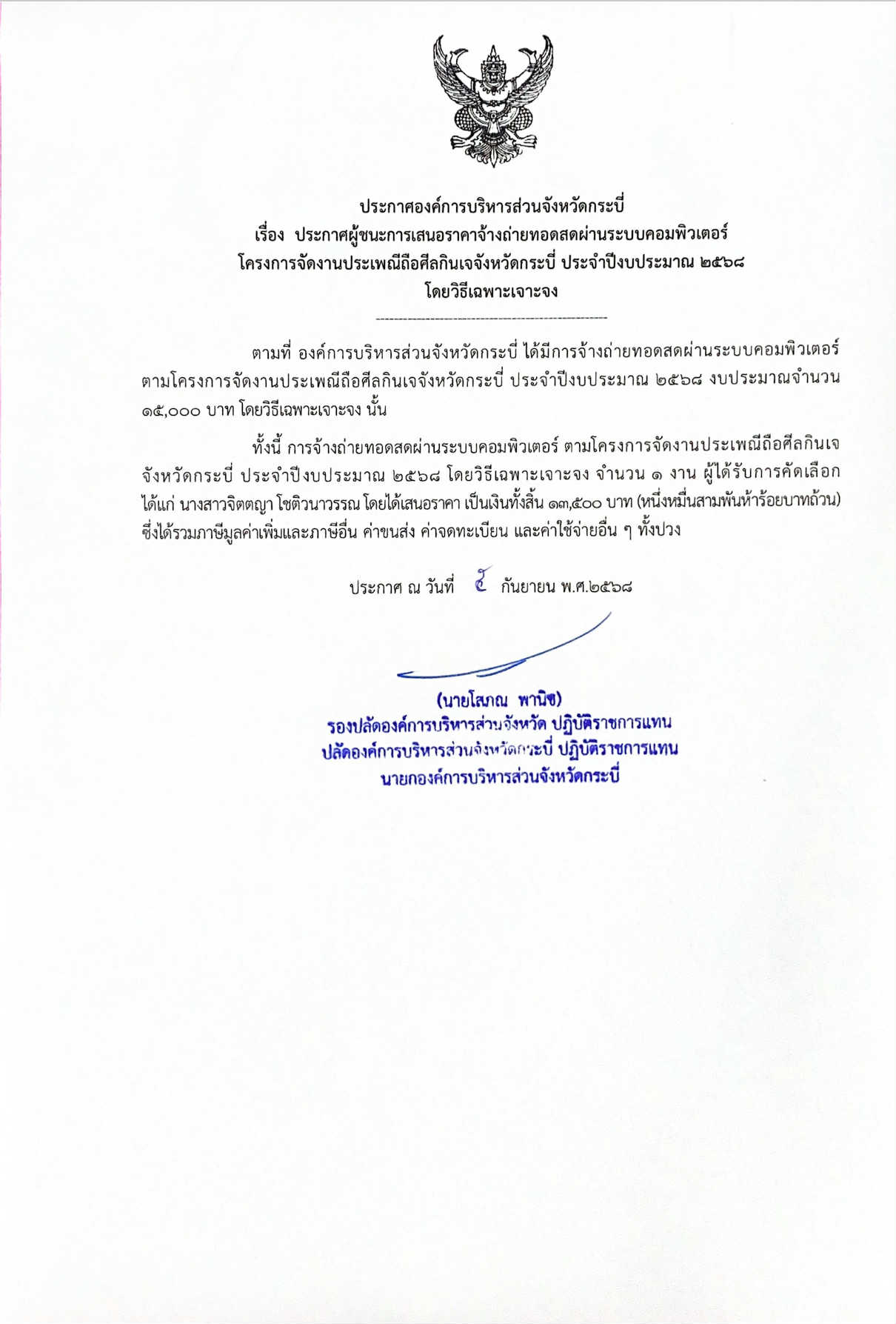 ผู้ชนะการเสนอราคา จ้างถ่ายทอดสดผ่านระบบเครือข่ายคอมพิวเตอร์พร้อมบันทึกภาพและวีดีโอ โครงการจัดงานประเพณีแห่จาดเดือนสิบจังหวัดกระบี่ฯ ประจำปีงบประมาณ 2568